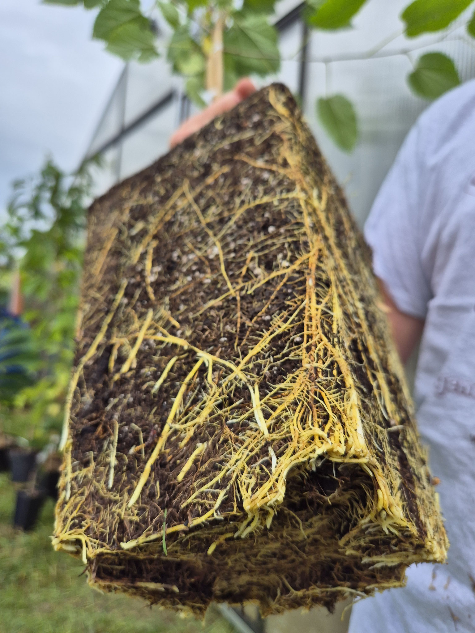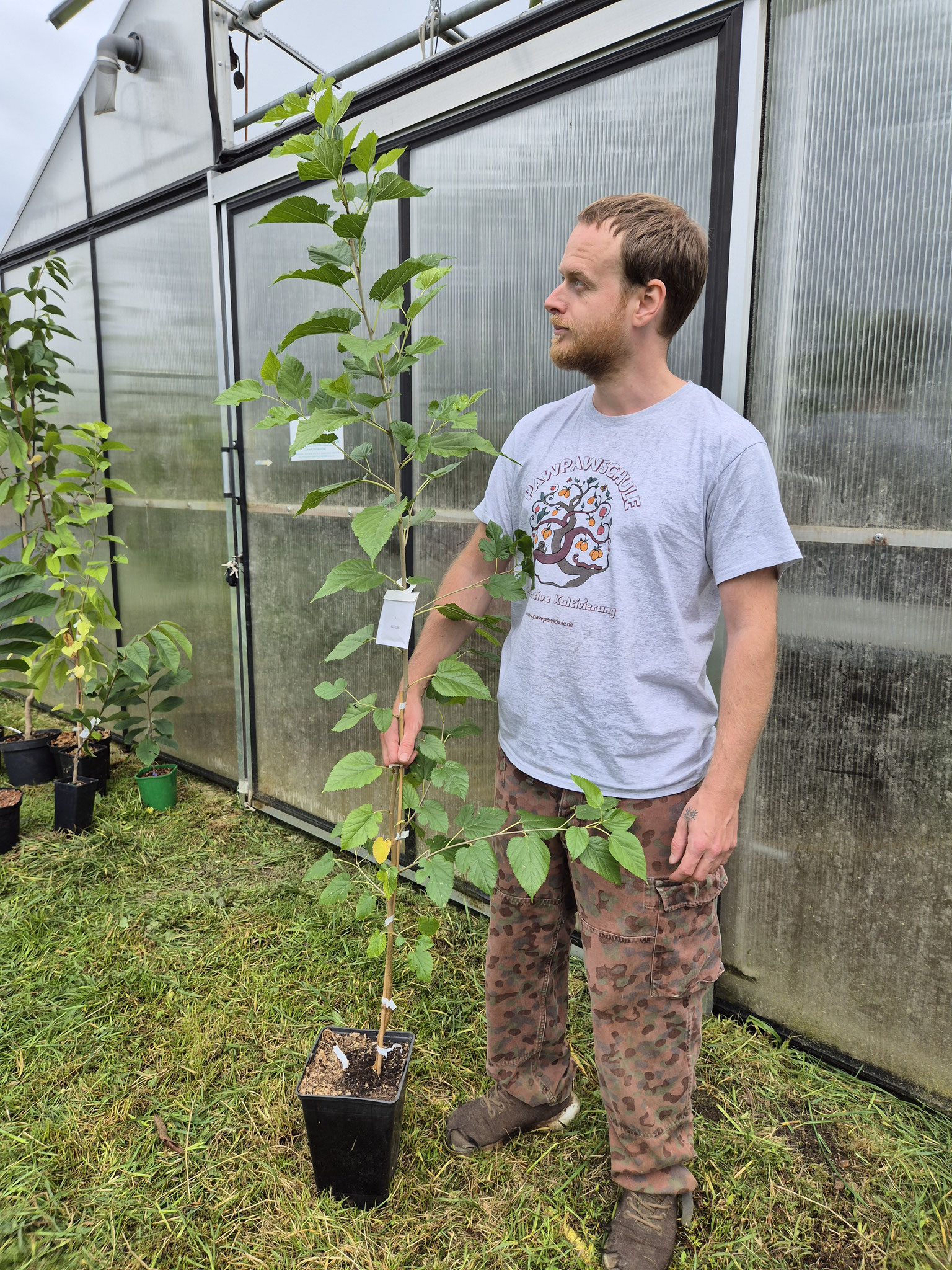 Als nicht ganz so frostharte Sorte bildet sie eine Ausnahme in meinem Sortiment, die Frosthärte dieser Sorte ist vergleichbar mit der von Feigen ca. -15 grad Celsius. Die Blätter haben einen hohen Zierwert und sind gezackt(wie Hühner Füße). Lange schwarze, süße Früchte, Ernte im Gewächshaus ab mitte Mai. Massenträger. Wir halten diese Sorte bisher im Kübel wo sie gut trägt.